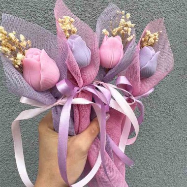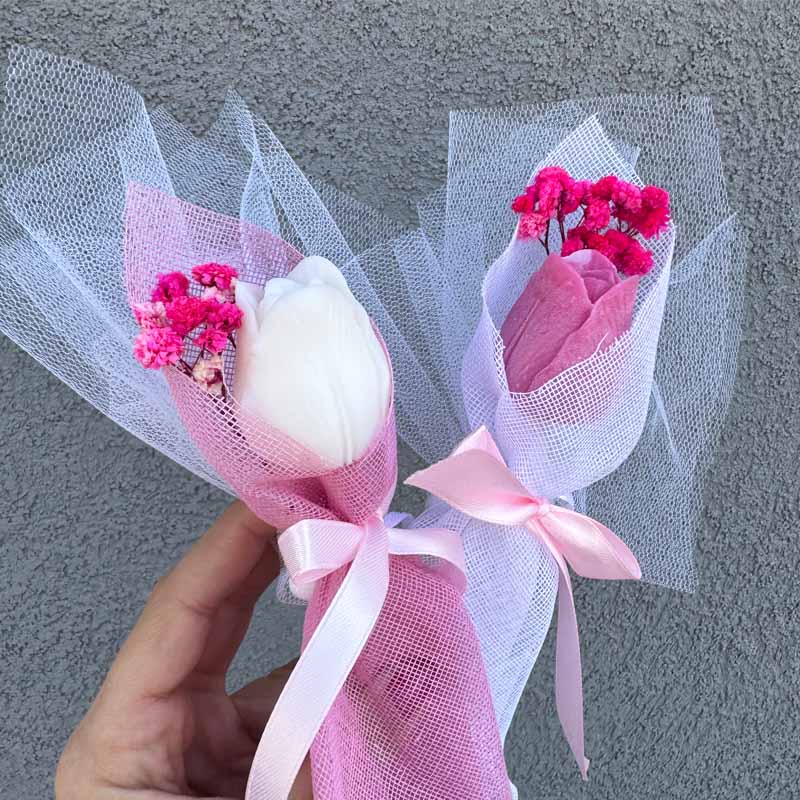 Ένα κομψό και ρομαντικό δώρο που ξεχωρίζει. Η σύνθεση με την τουλίπα, προσεκτικά τυλιγμένη σε φίνο ύφασμα και διακοσμημένη με σατέν κορδέλες και αποξηραμένα ανθάκια, αποπνέει φρεσκάδα, τρυφερότητα και διακριτική πολυτέλεια.