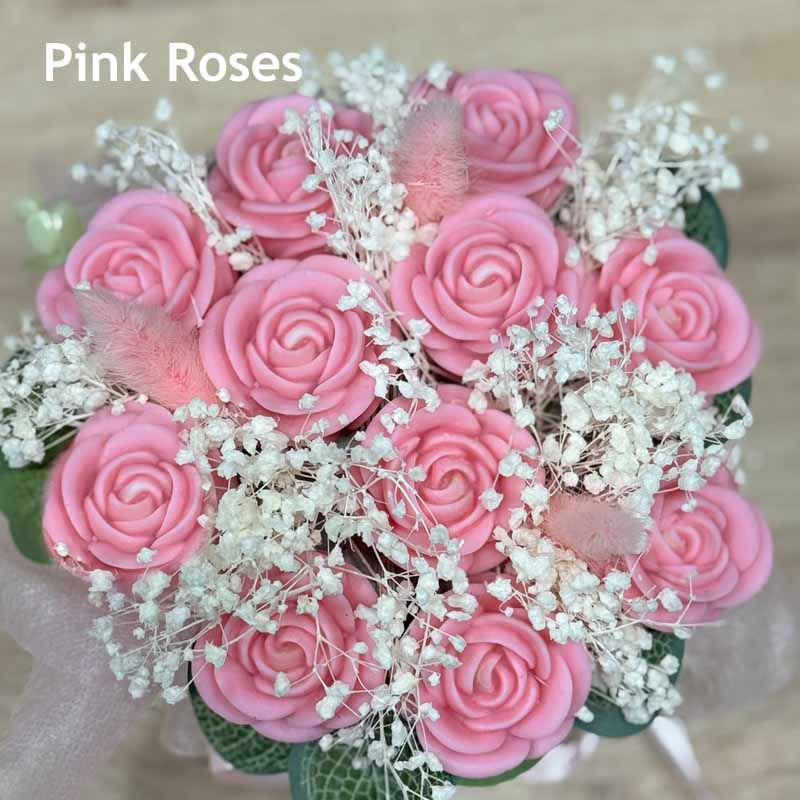 Χειροποίητα μπουκέτα λουλουδιών από κερί σόγιας σε διάφορες αποχρώσεις.
