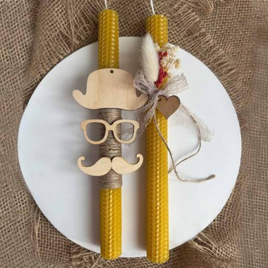 Η πρώτη λαμπάδα είναι διακοσμημένη με ξύλινα στοιχεία όπως καπέλο, γυαλιά και μουστάκι, δεμένα με φυσικό σπάγκο, δημιουργώντας ένα ιδιαίτερο και παιχνιδιάρικο στυλ. Η δεύτερη λαμπάδα συμπληρώνει το σετ με κομψή διακόσμηση από αποξηραμένα λουλούδια, κορδέλα και ένα μικρό ξύλινο καρδιάκι, συμβολίζοντας την αγάπη και την αρμονία του ζευγαριού.