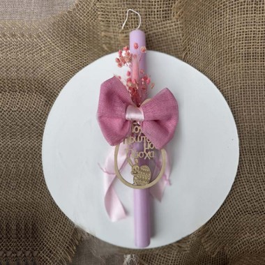 Χειροποίητη πασχαλινή λαμπάδα με στρόγγυλο σαγρέ αρωματικό κερί, διακοσμημένο με κορδέλες και ξύλινο μήνυμα.