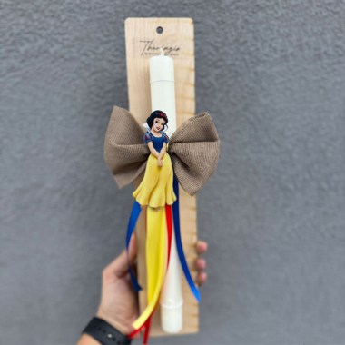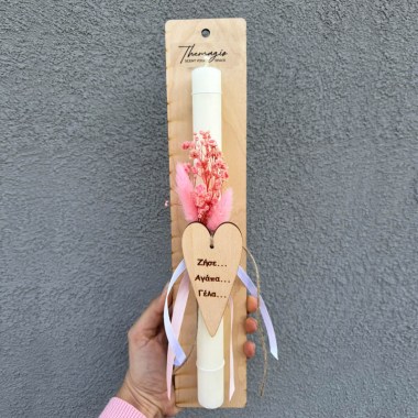 Χειροποίητη πασχαλινή λαμπάδα λεπτή διακοσμημένη με ξύλινο διακοσμητικό χρωματιστές κορδέλες.