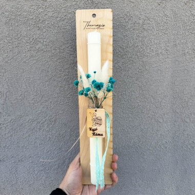 Χειροποίητη πασχαλινή λαμπάδα λεπτή διακοσμημένη με ξύλινο διακοσμητικό χρωματιστές κορδέλες.