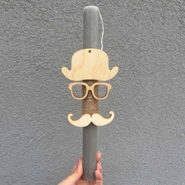 Χειροποίητη πασχαλινή λαμπάδα με πλακέ σαγρέ αρωματικό κερί, διακοσμημένο με κορδέλες και ξύλινη φιγούρα παπιγιόν.
